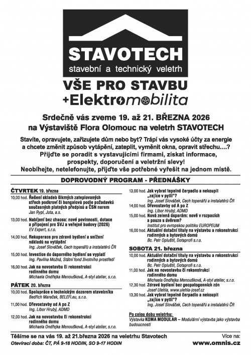 19. - 21. 3. 2026 10:00 - 18:00 Stavební a technický veletrh. Výstaviště Flora OIomouc, pavilon A Omnis https://omnis.cz 101-stavot.cs.avif