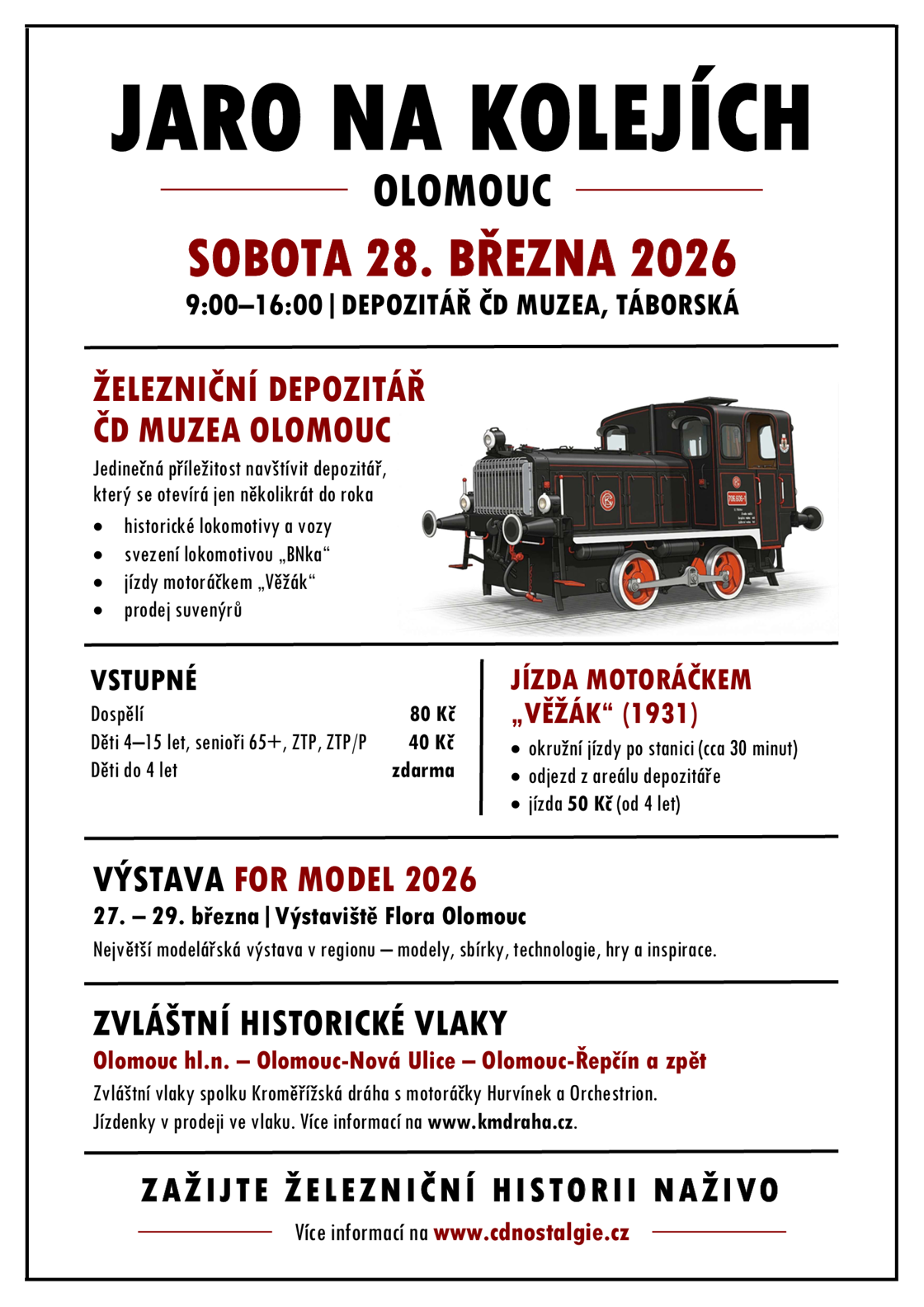 👉 Tip na celý den: spojte návštěvu s výstavou For Model 2026 na Výstavišti Flora a jízdou zvláštními historickými vlaky www.kmdraha.cz po Olomouci.