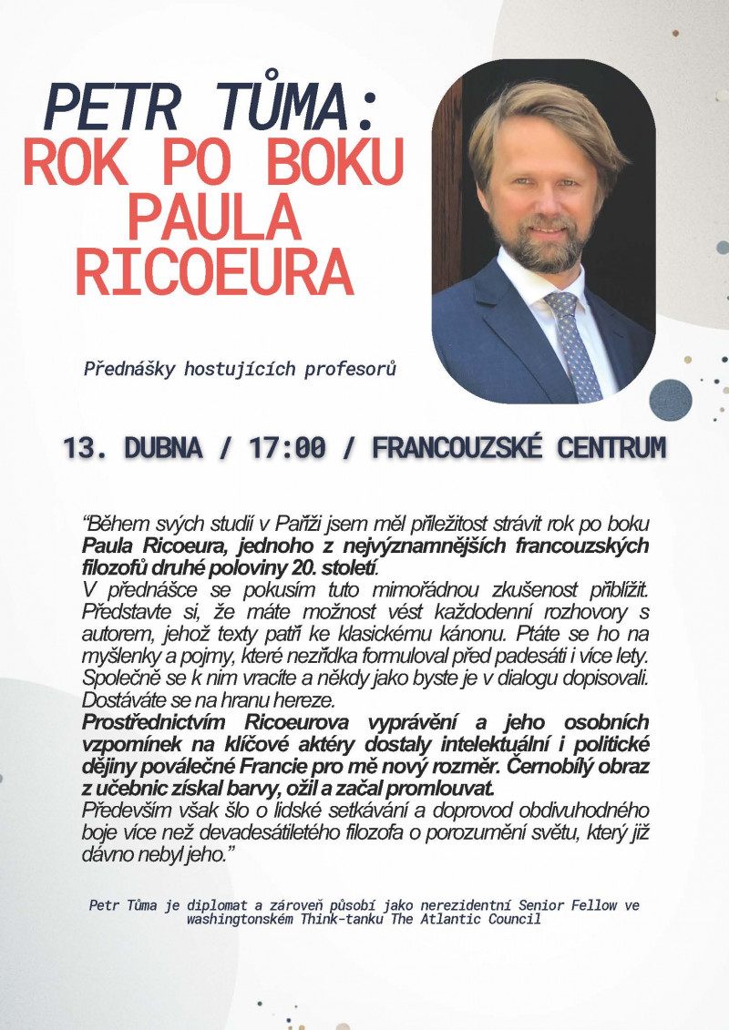 Zveme Vás na přednášku diplomata Petra Tůmy, který promluví o roce stráveném po boku filozofa Paula Ricoeura. Přednáška proběhne v rámci vernisáže výstavy věnované knihám, filozofii a dětem Philosophons, Philos'enfants!Filozofujme! Součástí Přednášek hostujících profesorů.