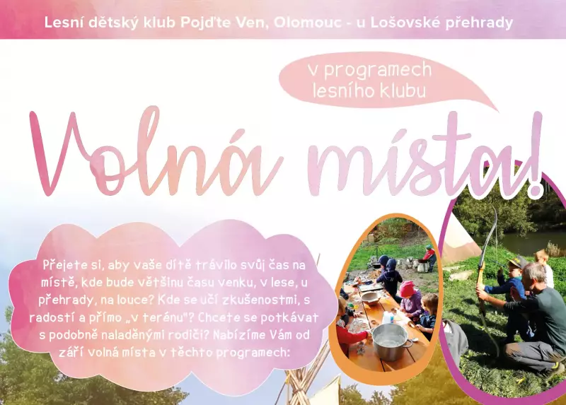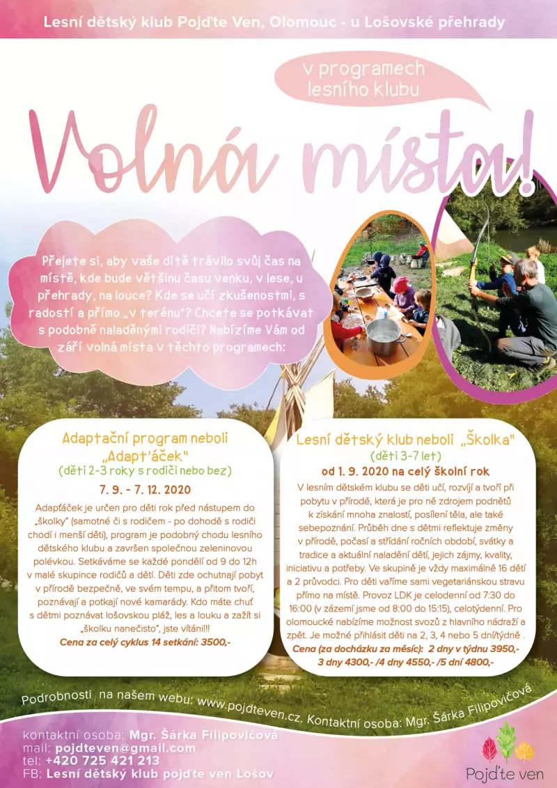 Lesní dětský klub Pojďte Ven, Olomouc - u Lošovské přehrady, nabízí poslední volná místa v Lesním dětském klubu ("školce") pro děti od 3 do 7 let a v Adaptačním programu pro rodiče s dětmi od 1 roku, případně samotné děti od 2 let. Více informací naleznete v příloze a na www.pojdteven.cz.