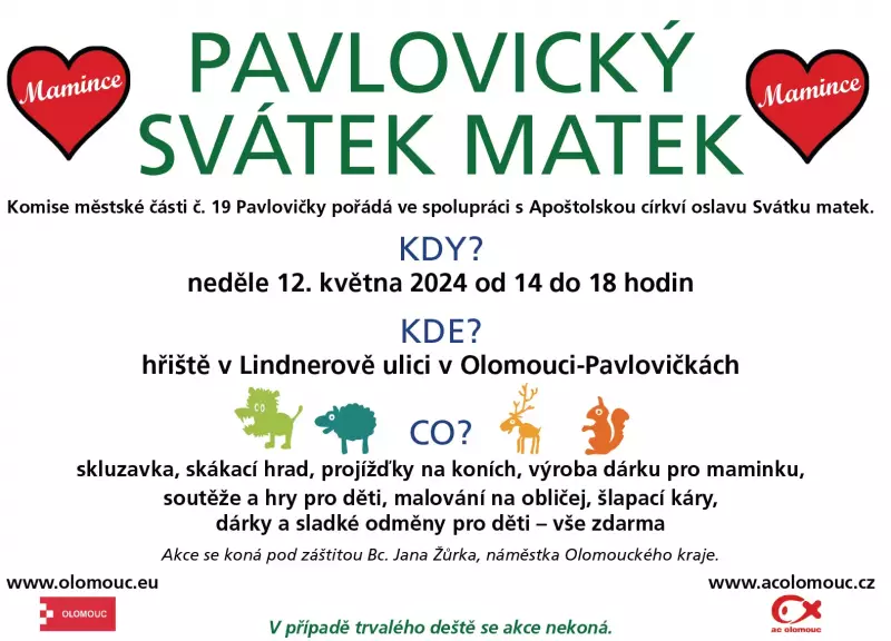 Komise městské části č. 19 Pavlovičky a Apoštolská církev zvou na oslavu Svátku matek, a to v neděli 12. května od 14 do 18 hodin na hřišti v Lindnerově ulici v Olomouci. Děti se mohou těšit na skluzavku, skákací hrad, projížďky na koních, soutěže a mnoho dalšího.