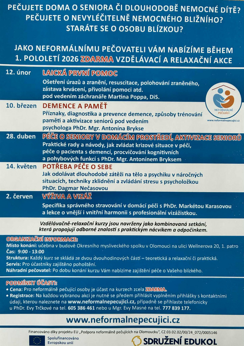 Zveme vás na soubor přednášek pro neformálně pečující o osobu blízkou, které obsahují jak vzdělávací, tak praktickou/relaxační část.