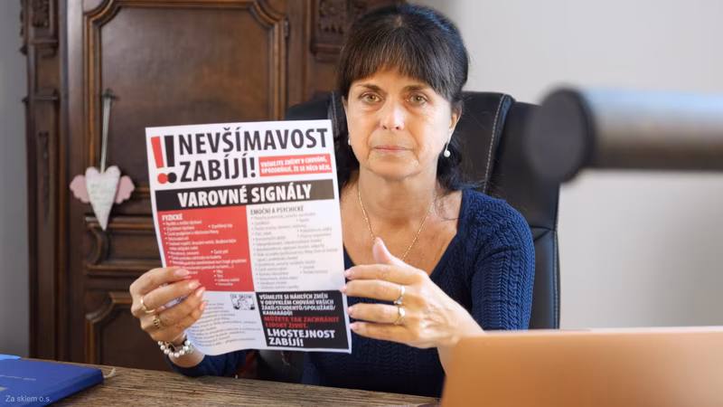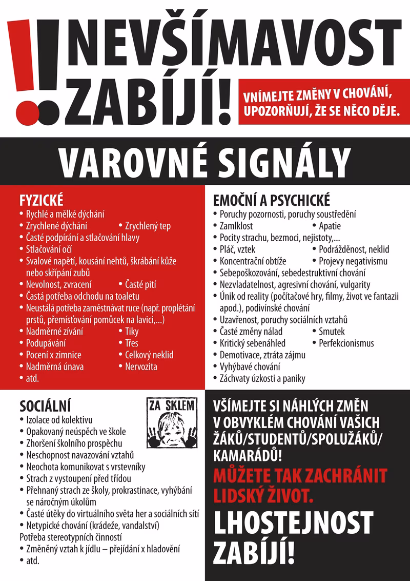V těchto dnech rozjíždíme osvětovou kampaň zaměřenou na informovanost veřejnosti o VAROVNÝCH SIGNÁLECH – stručném vodítku, které pomůže upozornit na psychickou nepohodu nejen dětí, žáků a studentů ve vzdělávacím systému, ale také našich dětí, kamarádů, blízkých… „Impulzem k jejich vzniku byl narůstající počet případů zhroucení žáků, v některých případech s nezvratným dopadem na jejich budoucí život, někdy až s dopadem fatálním,“ uvádí iniciátorka VAROVNÝCH SIGNÁLŮ a předsedkyně Za sklem o.s. Marta Pečeňová.